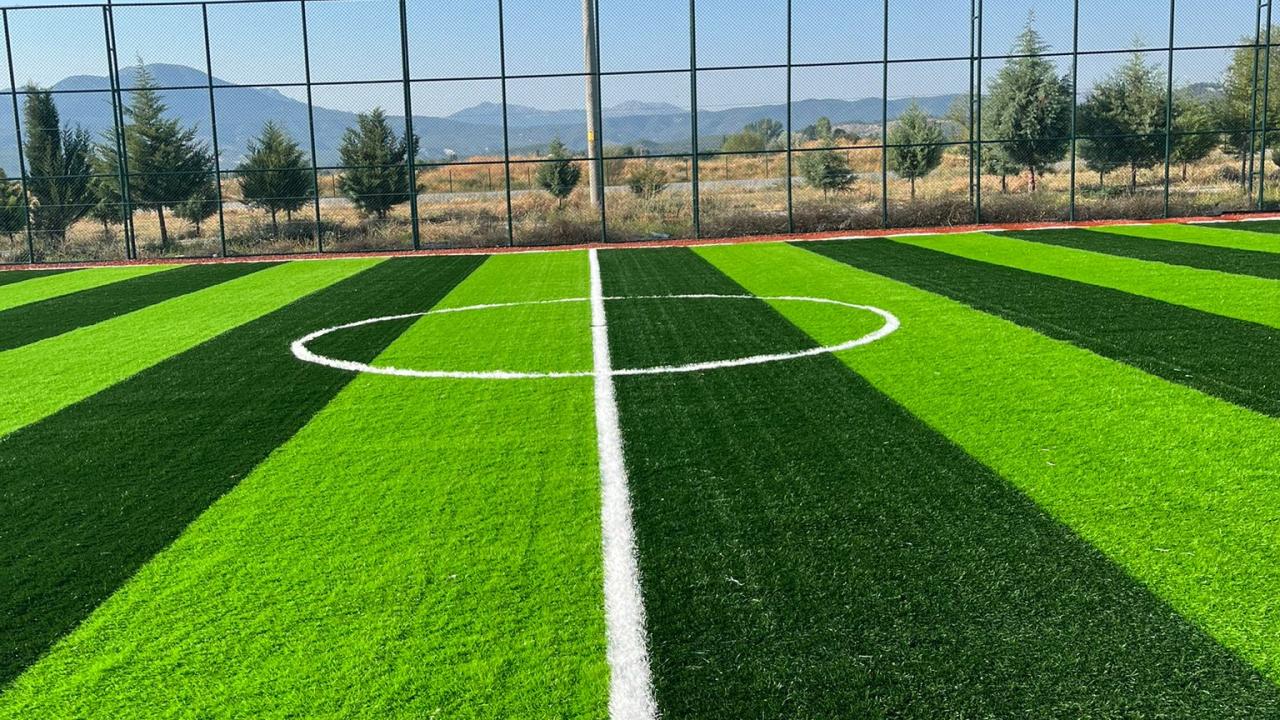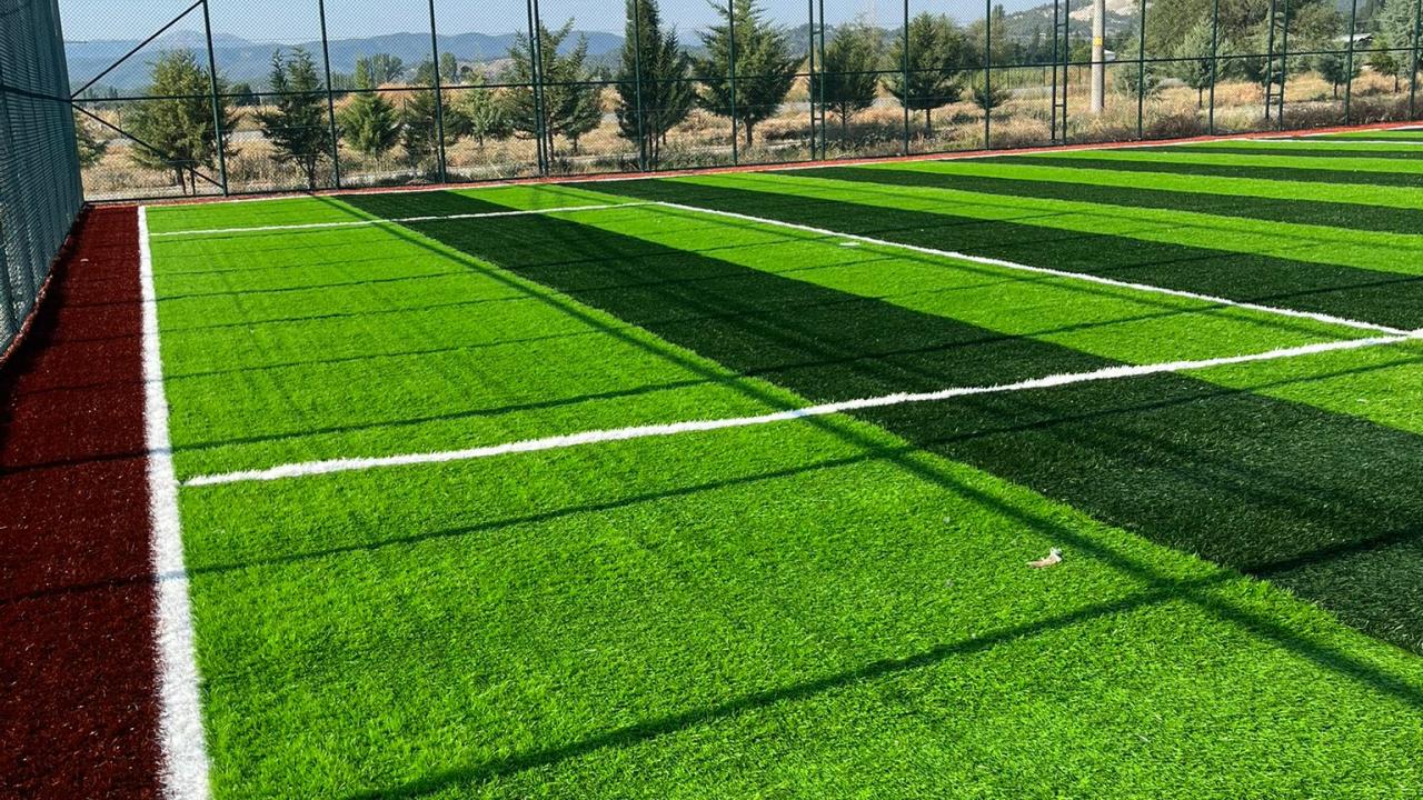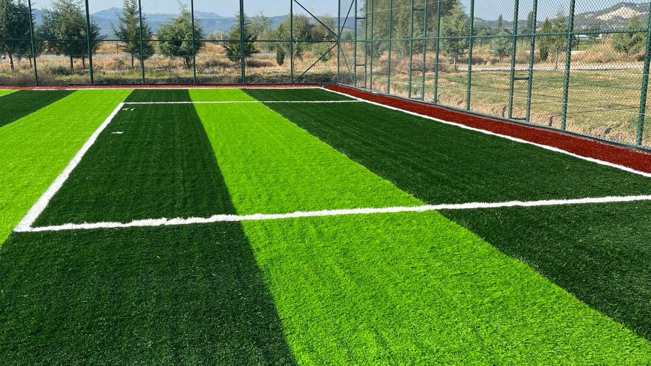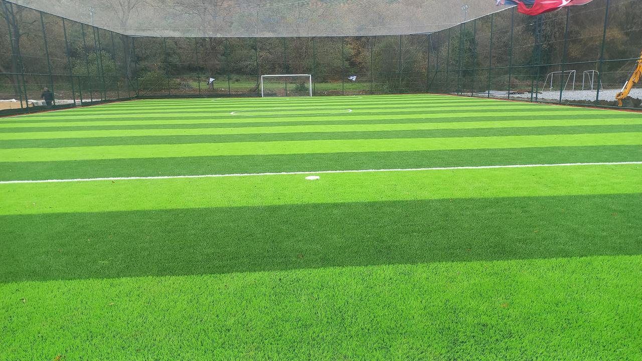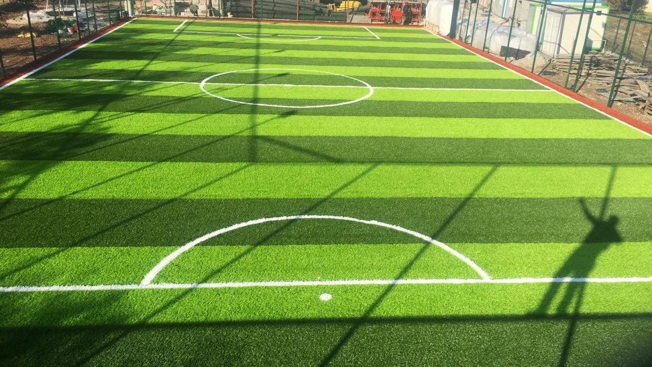 Hazırlanan dolgu zemin üzerine, komple sahayı kaplayacak şekilde jeotekstil taban malzemesi (keçe) serilir. Bunun üzerine, tercih edilen 40 mm / 50 mm / 55 mm hav yüksekliğindeki sentetik çim halı; özel yapıştırıcı kullanılarak ve helmetsin bezi ile birlikte zemine serilerek montajı yapılır.