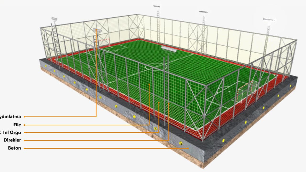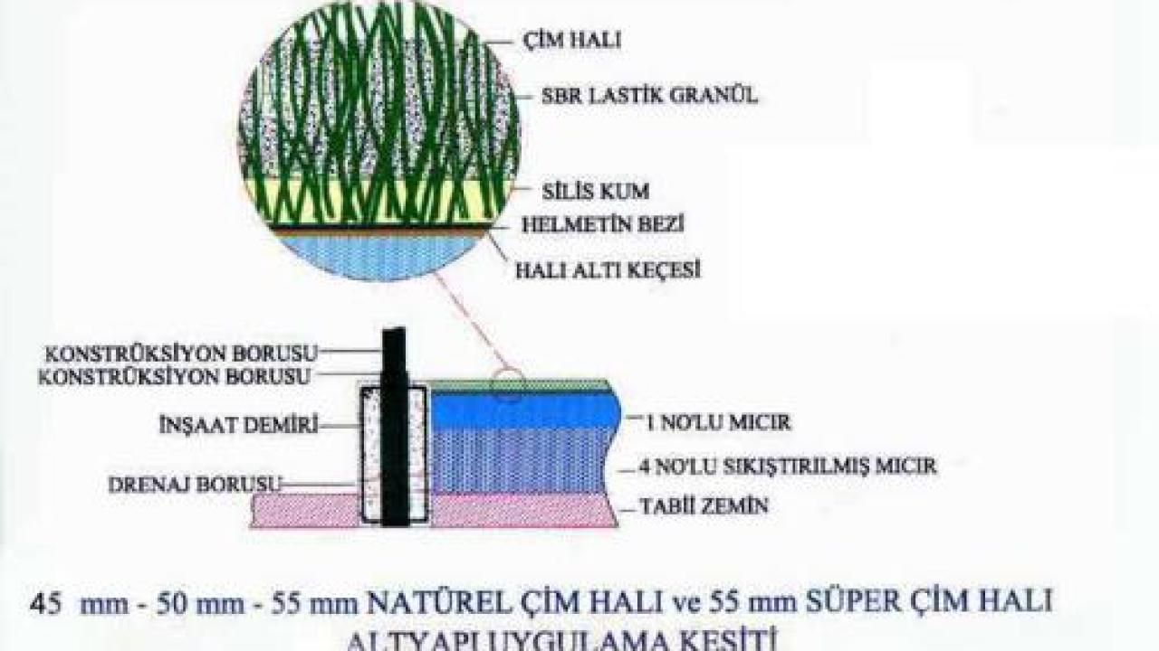 Sahanın inşa edileceği alan, işveren tarafından düzgün şekilde tesviye edildikten sonra; 20 cm toprağın içinde kalacak şekilde sahanın çevresi 50x30 cm çevre hatılı ile dönülür. Hatıl betonu döküldükten sonra oluşan havuz içerisine 20 cm yüksekliğinde 4 ve 5 numara mıcır doldurularak sıkıştırılır.